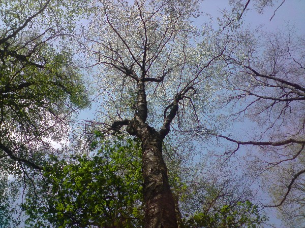 Wielka wiśnia lub czereśnia, obok jeszcze jedna trochę mniej dorodna. I kwitnąca.